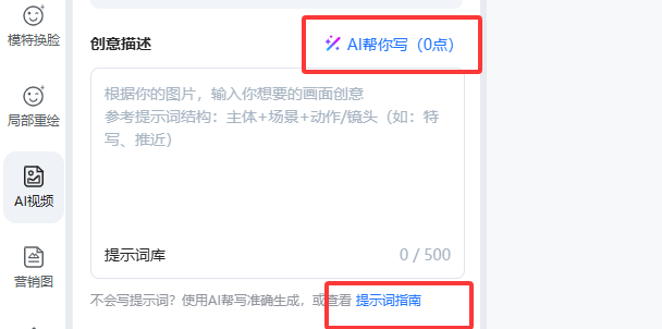 若对提示词创作感到困惑,平台提供了多重辅助工具: