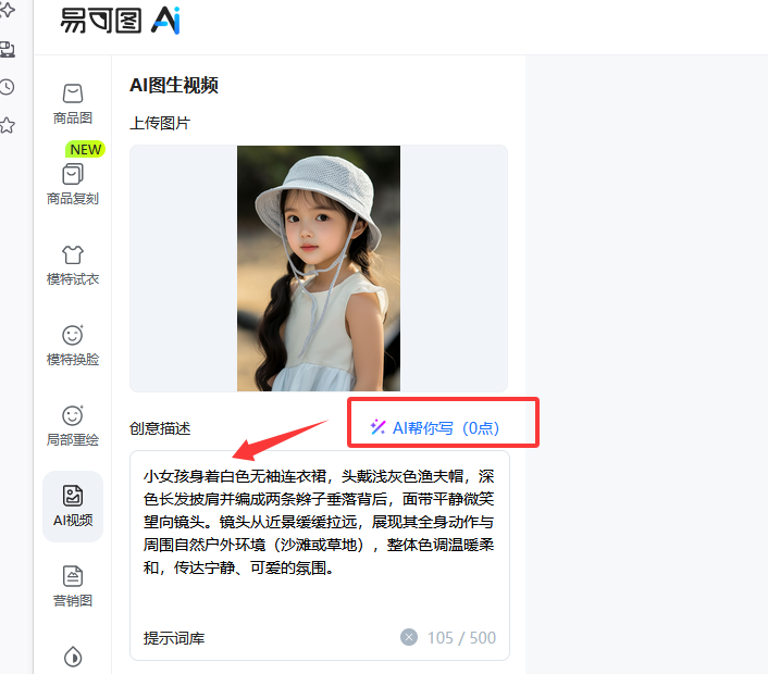 直接点击【AI 帮你写】,系统会根据上传的图片自动生成精准提示词,如针对一张小女孩的图片,AI 可能生成 “小女孩身着白色无袖连衣裙,头戴浅灰色渔夫帽,镜头从近景缓缓拉远,展现全身动作与周围自然户外环境,整体色调温暖柔和”。