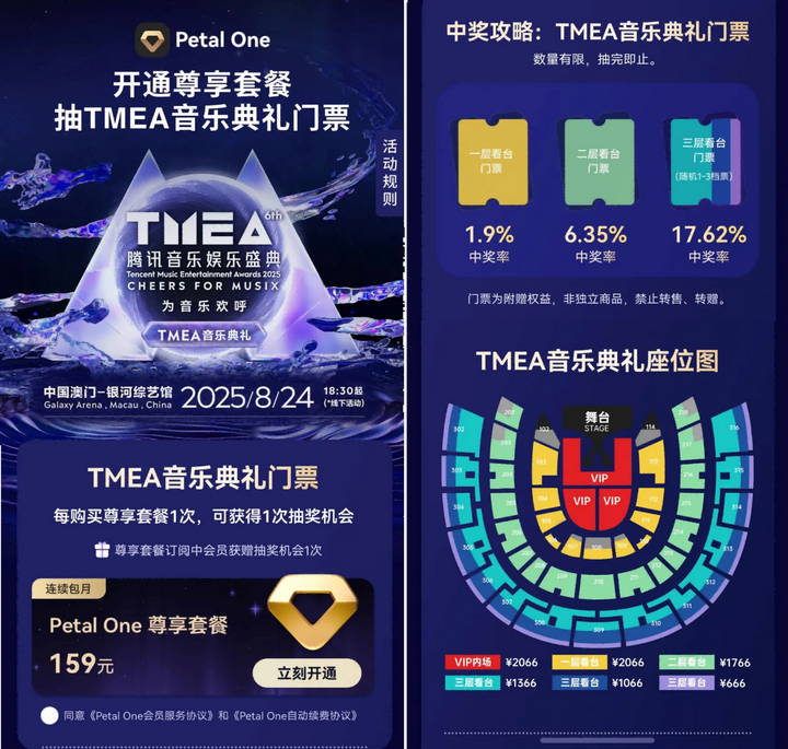 华为手机用户只要订阅华为Petal One尊享套餐,就能获得8月24日TMEA音乐典礼门票的抽奖资格。具体活动规则如下:每订一次Petal One尊享套餐(连续包月),即可获得一次8月24日澳门TMEA音乐典礼的门票抽奖机会,订阅次数越多,抽奖机会相应增加。订阅后用户可即时参与抽奖,抽奖结果实时揭晓,每个账号最多中奖次数限1次。一层看台门票中奖率为1.9%,二层看台门票中奖率为6.35%,三层看台中奖率达17.62%。中奖后,用户需及时完成领奖信息填写,以便门票邮寄。