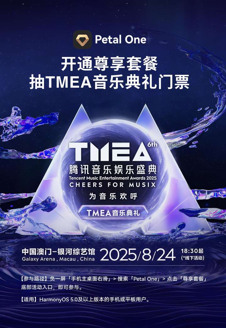 作为华语乐坛备受关注的年度盛事,2025年8月24日澳门TMEA音乐典礼即将启幕。本次典礼集结了蔡依林、檀健次、周深、汪苏泷等 30 余位华语顶流艺人,阵容涵盖多元音乐风格。自开票以来,门票瞬间售罄,火爆程度可见一斑!为满足广大乐迷的期待,华为携手TMEA推出订阅 Petal One 尊享套餐抽取门票活动,用户开通即可获得典礼门票抽奖资格,同时畅享多重会员权益。