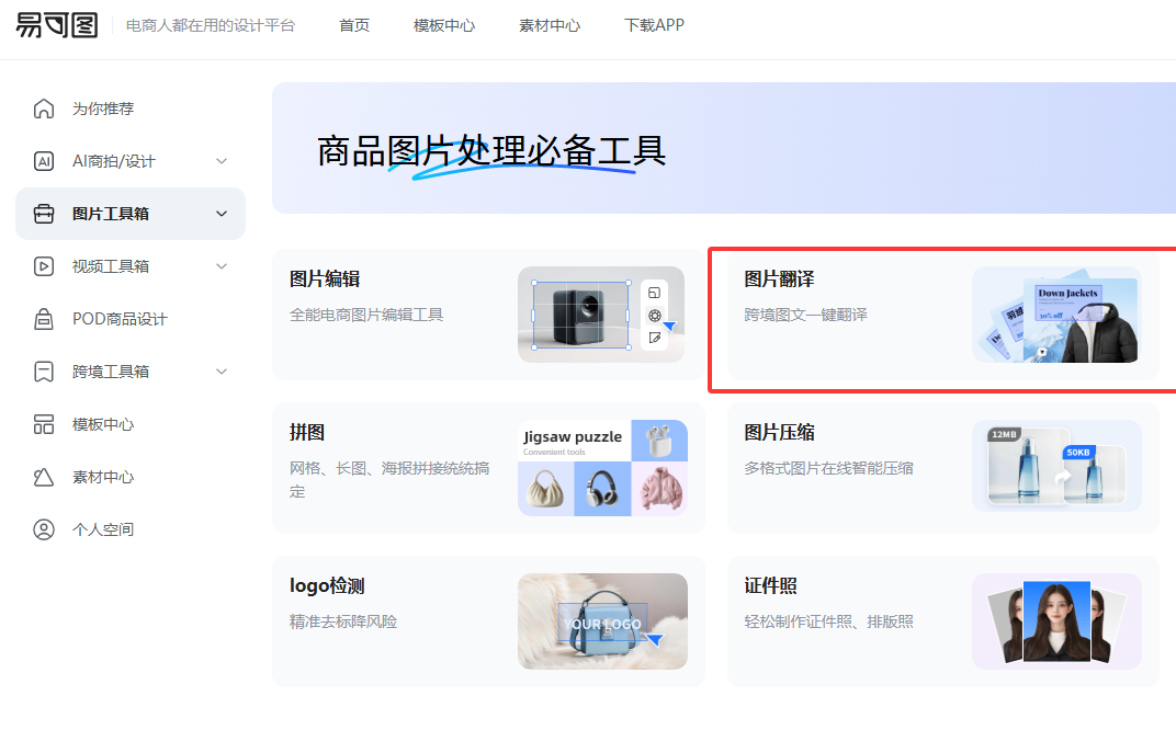 想要使用易可图的图片翻译功能,可以前往平台的【图片工具箱】版块,点击 【图片翻译】 选项,即可跳转至翻译功能页面,随后上传需要翻译的图片即可开始操作。具体操作步骤如下: