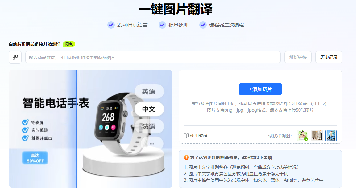 “翻译商品主体文字”:若图片是电商商品图,勾选后可重点翻译产品名称、规格等核心信息;