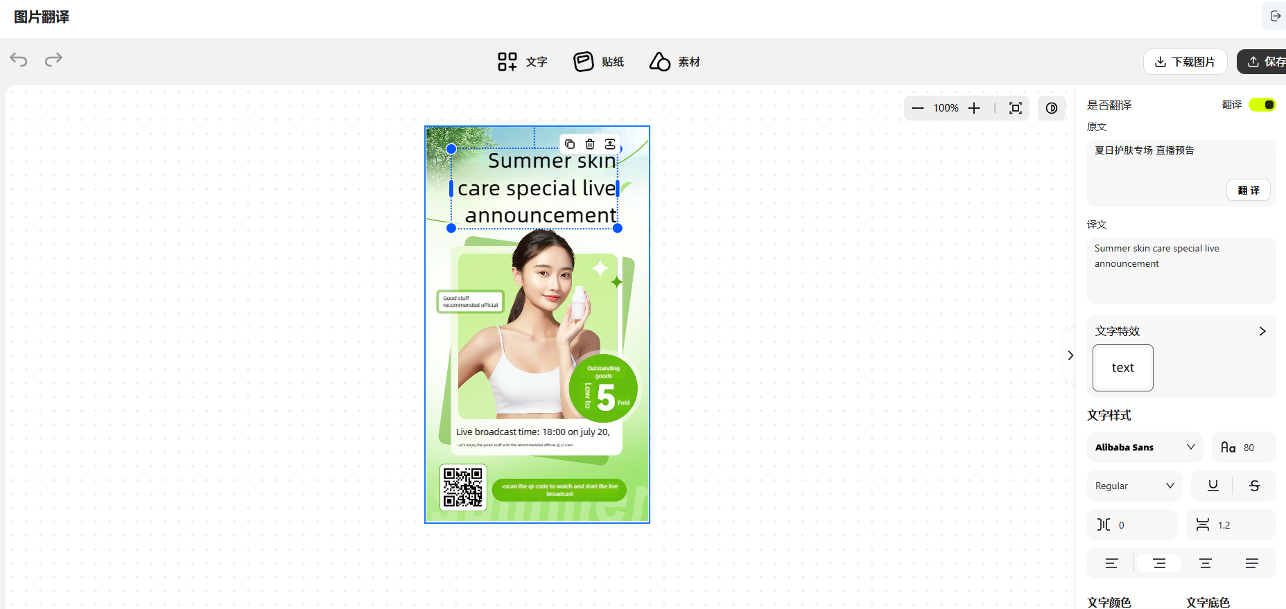 若对翻译后的文字位置、字体样式、大小或颜色不满意,可点击 “手动调整” 进入编辑页面。在这里,不仅能调整文字的位置、大小、颜色和字体(支持 Alibaba Sans 等多种字体),还能使用编辑器内置的贴纸素材(如折扣标签、活动标识等),让翻译后的图片更符合排版需求。调整完成后,点击 “确认翻译” 即可。