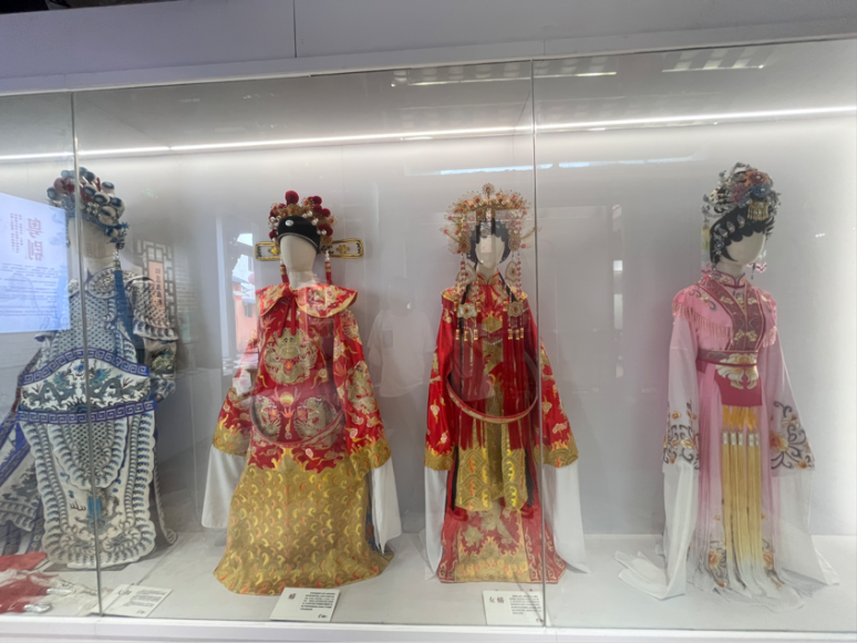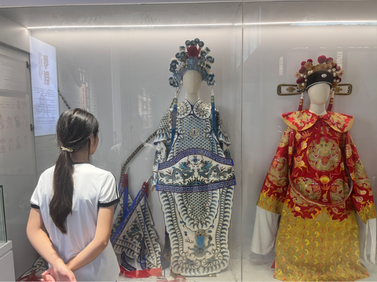 在粤语粤剧传承基地 “粤韵堂”,队员们的目光被精美的戏服吸引:华丽的凤冠霞帔、绣工精湛的蟒袍,每一件都像在诉说舞台故事。他们一边拍摄戏服细节,一边记录墙上展板关于粤剧起源、行当、经典剧目的介绍。“我们要建一个粤剧数字资源库”,队员们当场约定,回去后就开始收集整理剧本、曲谱、老唱片、老照片,让这些老唱腔被更多人听见。
