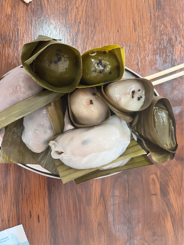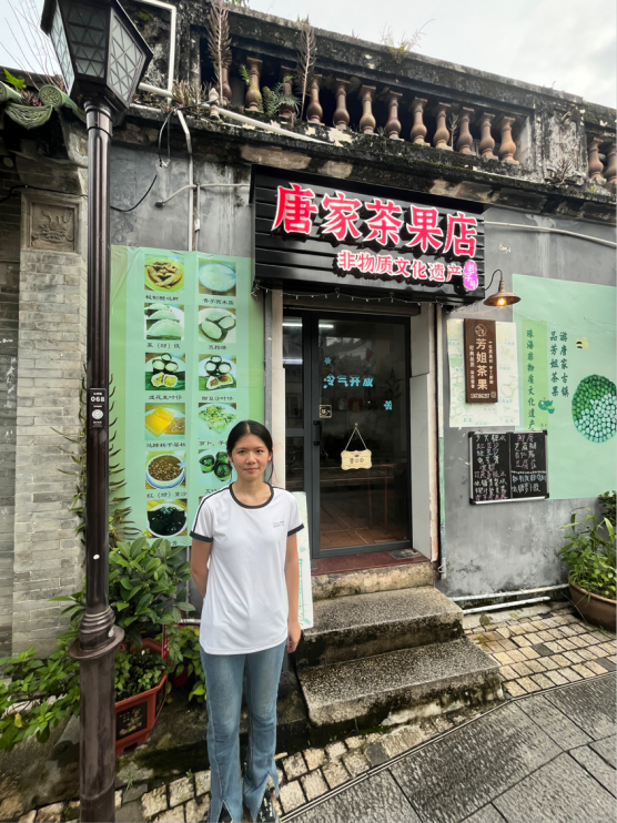 调研最后一站,巷尾的 “唐家老字号茶果店” 飘出清香。队员们看着店主将刚蒸好的叶仔糍、萝卜糕摆上木盘,粽叶混着糯米的香气扑面而来。“以前男人出海前必吃这个”,店主的话勾起了大家的兴趣,队员们立刻拿出录音笔:叶仔糍用蕉叶包着,既防潮又象征 “顺风”;馅料里的本地海虾干,是祖先与大海打交道的智慧。品尝过软糯香甜的茶果后,队员们拉着店主讨教配方,“我们想帮你把配方标准化,再结合古建元素设计包装,吸引更多年轻人”,这个想法得到了店主的认可。