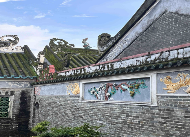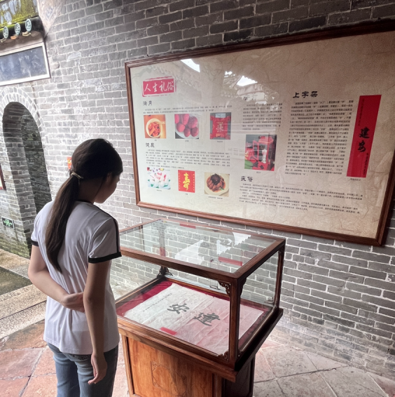午后的唐家民俗馆,阳光斜照在玻璃展柜上。队员们围着 “光绪年间唐家婚嫁器物” 驻足,红绸包裹的木箱上 “海不扬波” 的木雕字样格外醒目,大家立刻查阅资料,结合馆内的渔船模型、侨批(海外侨胞家书),梳理出唐家湾 “农耕底色 + 海洋印记” 的民俗脉络。在寿山梁公祠,队员们对着古老石壁上的碑文逐字解读,仿佛在与先祖进行跨越时空的对话,笔记本上很快记满了关于家风传承的关键词。