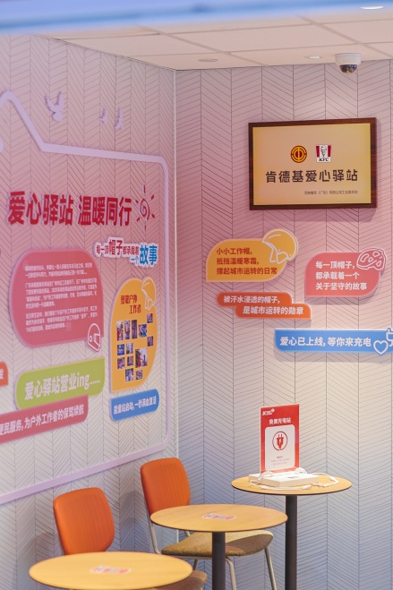 餐厅的墙壁上,还贴满了暖心的话语:“累了歇一歇,喝口水再出发”“能量站启动,一秒满血复活”“爱心已上线,等你来充电”……肯德基爱心驿站宛如一座功能完备的“能量补给加油站”,关注着新业态户外劳动者的需求,为他们提供一个能够让疲惫得以缓解、身心能够放松的温馨场所。