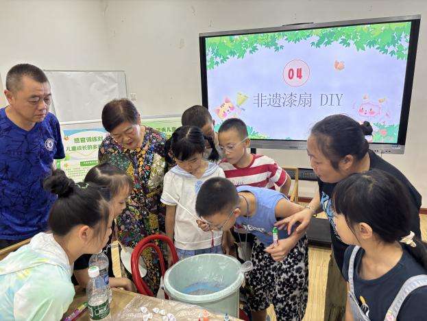活动的最后环节是充满文化韵味的非遗漆扇DIY体验。专业老师先介绍了漆扇的历史和文化意义,示范了漆扇绘画的基础技巧。之后,家长协助孩子在素面木扇上自由创作,老师和志愿者巡回指导,鼓励孩子们发挥想象力,培养了他们的审美能力和手部精细动作。