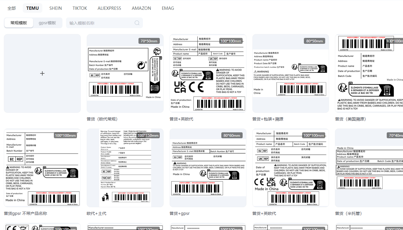 进入易可图跨境合规标签功能页面,我们要先选一个合适的模板,易可图的模板库按商品类型和地区做了分类,比如普货+通用、玩具+欧代等,你可以根据自己的商品属性选择对应的模板。
