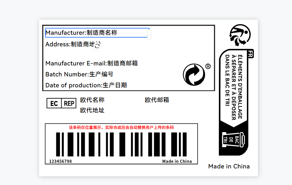 欧代信息补充:专门的 “EC REP” 区域需要填写欧代公司名、地址、邮箱,这部分是欧代标签的关键,必须准确无误,确保欧盟监管机构能顺利联系到欧代方。