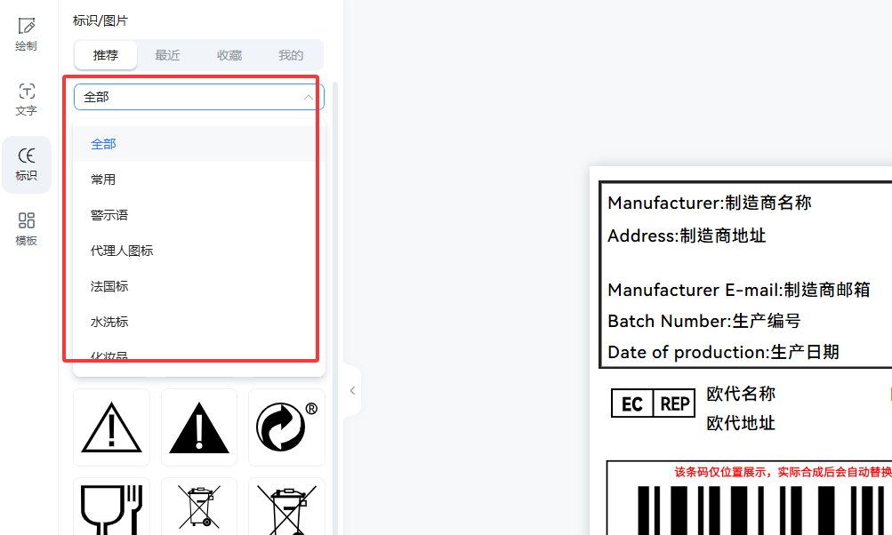 用工具优化标签布局:如果觉得模板布局需要微调,可以用功能里的绘制工具(矩形、水平线、垂直线等)添加表格或分隔线,让信息更清晰;若需要添加 CE 标识(欧盟强制性认证标志),直接从内置的 “CE 图标库” 里筛选合适的图标,点击就能添加到画布,不用自己找素材,还能避免用错不合规的标识。
