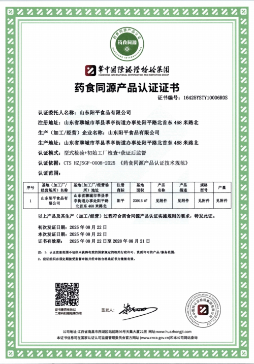 此前,阳平公司已先后通过 ISO9001 国际管理体系、ISO22000 食品安全管理体系认证,在产品质量把控上积累了丰富经验。此次获得药食同源产品认证,更是对阳平食品在健康食品领域卓越成就的权威认可,标志着公司在大健康产业的道路上迈出了坚实的一步。