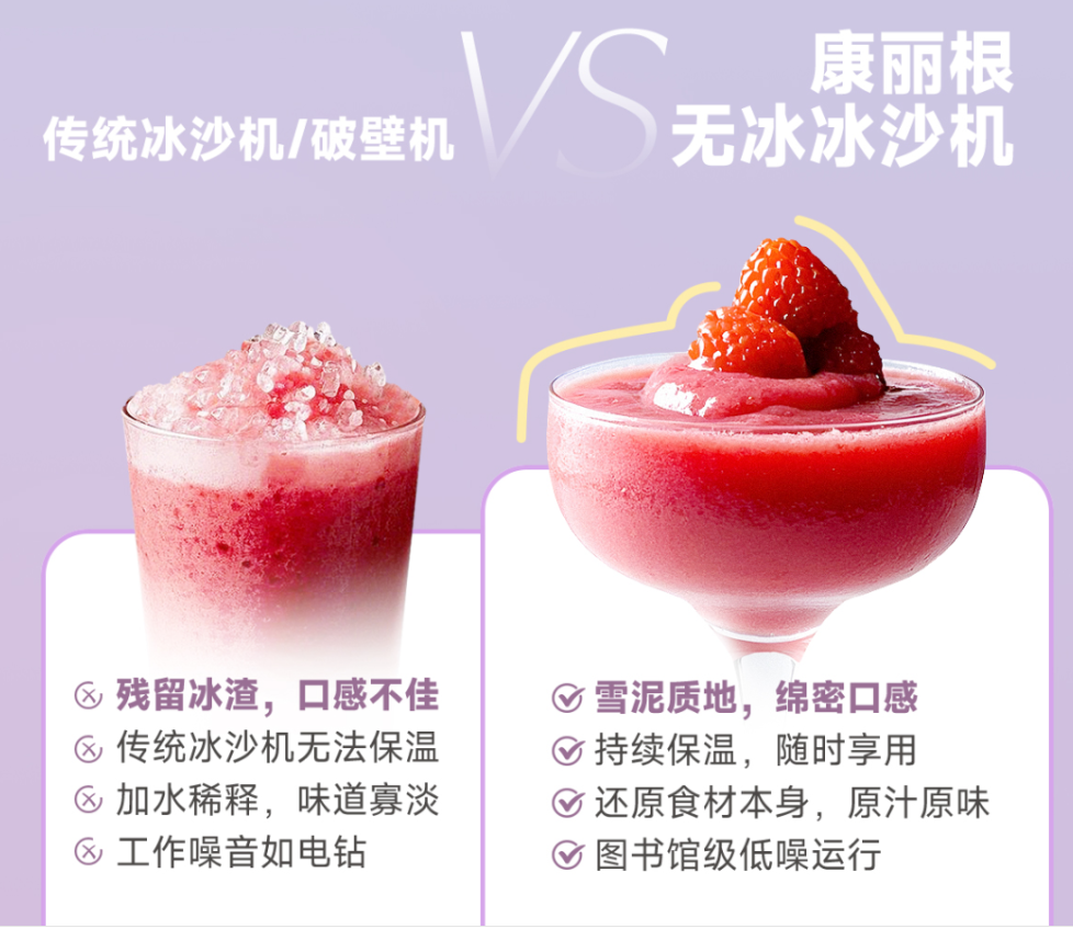 盛夏午后,最幸福的瞬间是什么?不是打开冰箱找冰块,而是一杯绵密、清凉、不稀释的冰沙入口即化。然而,传统冰沙的“冰”却常常让这份幸福大打折扣:提前制冰、碎冰机轰鸣、冰块融化冲淡风味……康丽根用一台无冰冰沙机,把这一切统统变成“过去式”。