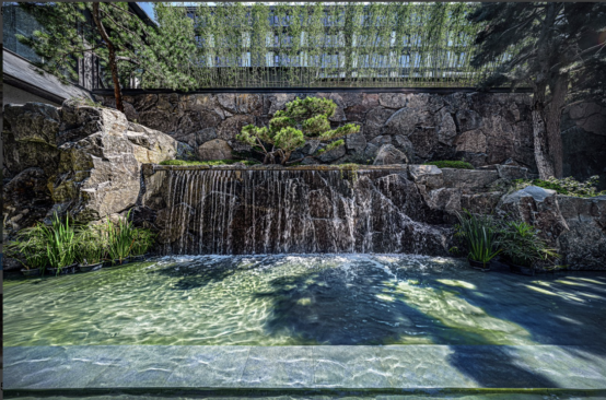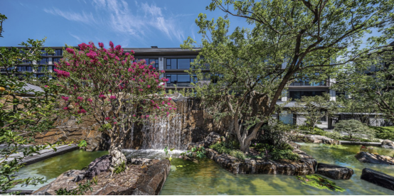 走进中建宸园的实景交付现场,整座园林筑于约1.5米的台地上,起伏又舒缓的高差,营造出居者感官上的错落,既有真山真水之美,却无攀登之劳。步入庭院,脱胎于宋代山水画的生动景观映入眼帘:飞瀑、跳泉、浅溪、山涧....形式多样的水景,带来天然灵动与生趣。园中巨树林立:东西园中各有一棵老树紫薇、高13米的参天银杏、10米的巨大白蜡、9米的造型松....,以虬枝盘曲的姿态伸向天空,为园林增添勃勃生机。
