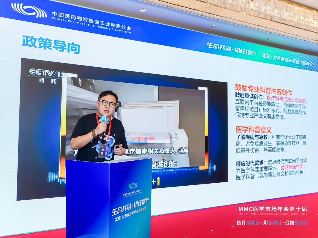 中国医药物资协会工业电商分会理事、知识矩阵董事长丁肇亮结合实际案例,分享健康科普在提升企业品牌知名度、促进产品营销方面的重要作用,介绍健康科普内容创作与传播的有效策略。