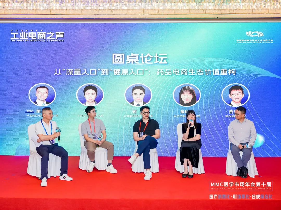 由千金药业电商销区总经理雨林主持,多普泰制药副总经理甘一、九典制药新零售总经理郑梁、九芝堂新零售部经理黄娟花、南方健康总经理贾开祥参与讨论。嘉宾们围绕药品电商从单纯追求流量到注重健康服务价值转变的趋势,探讨生态价值重构的路径与方法,分享企业在提升健康服务能力方面的实践案例。