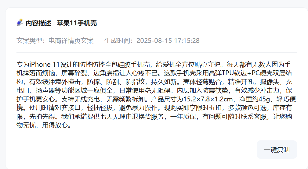 第三步,等待生成并调整使用。点击 “立即生成”,几秒钟后就能得到一篇完整的文案。以苹果 11 手机壳为例,生成的文案会从 “保护爱机” 的需求切入,详细讲清 “双层结构防摔”“轻薄不笨重” 等卖点,甚至还会包含规格参数、使用注意事项和售后服务,逻辑清晰又全面。生成后,直接复制需要的部分就能用。