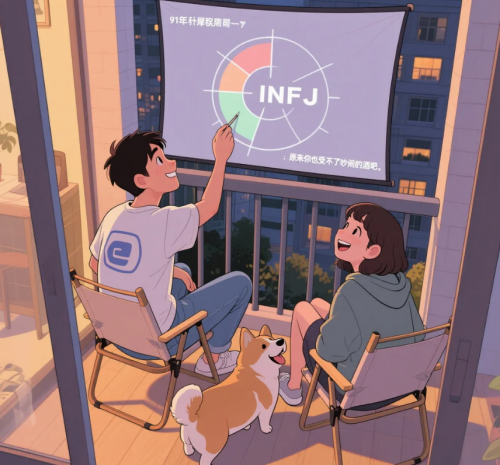 我旁边坐的是 91 年的程序员阿豪——雷达图显示他跟我只差一个字母:INFJ。他画了一座带投影幕布的阳台,说想一起窝着看电影。我画了两把露营椅和一只柴犬。我们抬头对视,突然同时笑场:“原来你也受不了吵闹的酒吧。”
