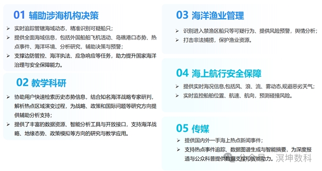 溟坤数科致力于成为全球领先的海域态势感知数据服务厂商,在多源数据融合、信息检索知识分析等领域拥有核心技术优势。公司聚焦海域态势感知数据融合和AIGC,为用户提供系列多维、全景和动态的数据产品,将海洋战略与政策领域的行业研究优势和经验以数据服务形式回报国家与社会,助力国家机关、军队、智库和高校等在海域态势感知领域的决策和研究。