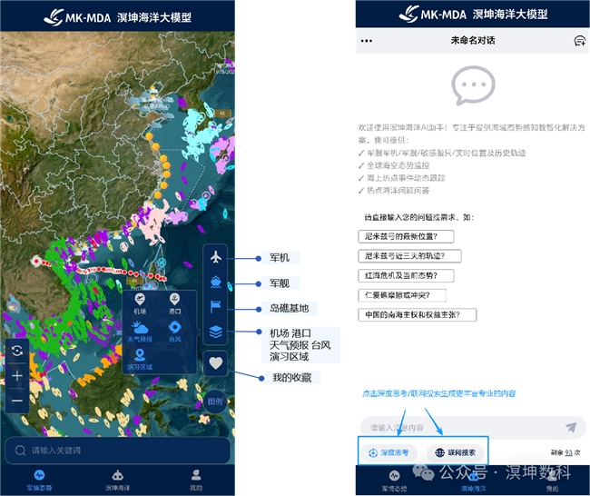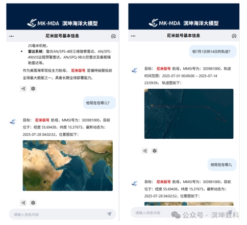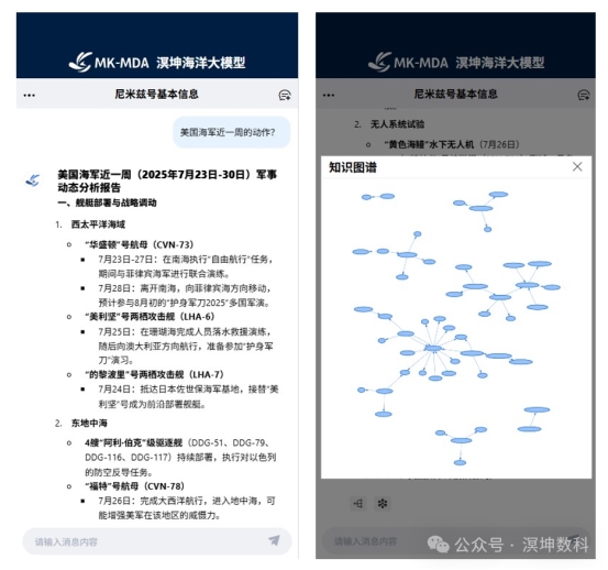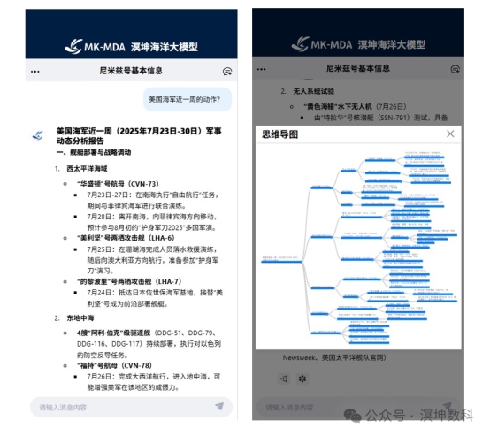 溟坤海洋大模型具备多模态可视化输出能力,如针对“美海军尼米兹号最新位置?”的问题,系统可生成专业位置图和历史轨迹图;此外,溟坤海洋还支持军机军舰名/ICAO号/MMSI号多目标、多时态提问;该智能体融合大模型在语言理解与推理方面的能力,兼具国内外全网检索能力,能够实时响应用户提出的复杂问题,如“红海危机及当前态势?”、“中国的南海主张”等,并可生成具备因果逻辑结构的完整解答,自动输出思维导图、知识图谱等结构化图形内容。帮助用户在复杂情报中快速建立认知,提升态势理解与决策效率。