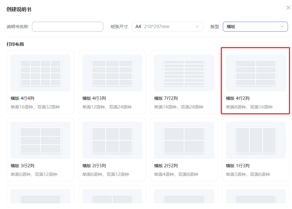 第一步是给说明书搭骨架。点击 "创建说明书" 后,先填好产品名称,选个合适的纸张尺寸,A4 是最常用的。重点是排版布局,如果你要做10种语言,选 "横版 4 行 2 列" 的布局就很合适,单面能放 8 种语言,双面刚好 16 种。这个就像搭积木,先把框架搭好,后面填内容就轻松了。