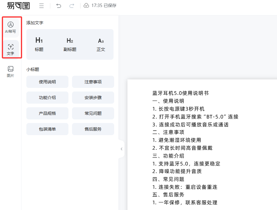 第二步是填内容,这里有两种方式。如果你的产品是常见的家电、数码类,推荐用 AI 自动生成,输入产品名称后,勾选需要包含的内容,比如使用说明、注意事项这些,设置好字数限制,点一下 "立即生成" 就搞定了。生成的文案还能直接调整字体颜色、大小,用的是阿里巴巴普惠体,看起来很专业。要是你的产品比较特殊,AI 生成的内容不够精准,就用手动制作,左边有现成的 "安装步骤"" 保养要求 " 这些小标题,直接用就行,比自己排版省事多了。