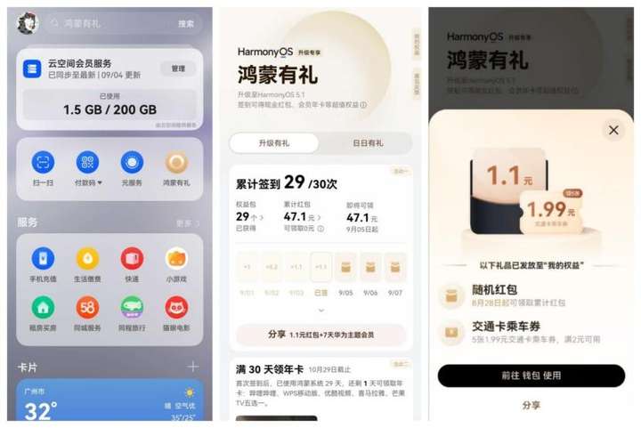 顺便安利大家,现在升级HarmonyOS 5.1的用户还能领取升级专享的“鸿蒙有礼”权益礼包,每天在桌面右滑到负一屏点“鸿蒙有礼”,完成签到即可领取惊喜福利,有机会解锁10+款热门应用的会员。而且首次签到后第30天还送年卡免单券,(WPS、喜马拉雅等App五选一),直接省下至少未来一年的会员费,数量有限、先到先得!