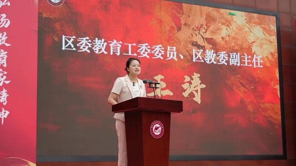 长寿区委教育工委委员、区教委副主任王涛在致辞中高度评价学校发展成果,基建焕新颜,管理创标杆,新媒体矩阵传递教育好声音!