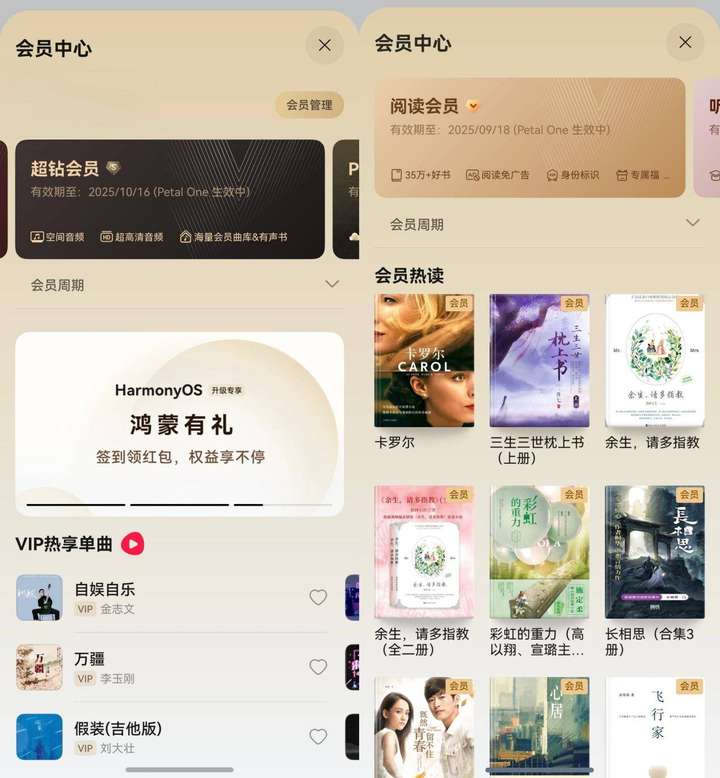 解锁追剧听歌阅读自由:音乐、视频、读书平台有很多个,不同平台的资源又不尽相同,每次想听哪首歌曲、看哪部电影、读哪本书籍,找资源就要花费很多时间,Petal One尊享套餐中包含的会员权益,可以直接解锁追剧听歌阅读自由。华为音乐会员可享千万曲库,空间音频的听歌效果个人非常喜欢;而华为视频超钻会员,更是汇聚了多影视平台内容,例如芒果TV的热门影视剧综都能看;华为阅读拥有百万级书库,无论是我喜欢的“金庸全集”还是日常必读的经管社科类书籍,都非常全。