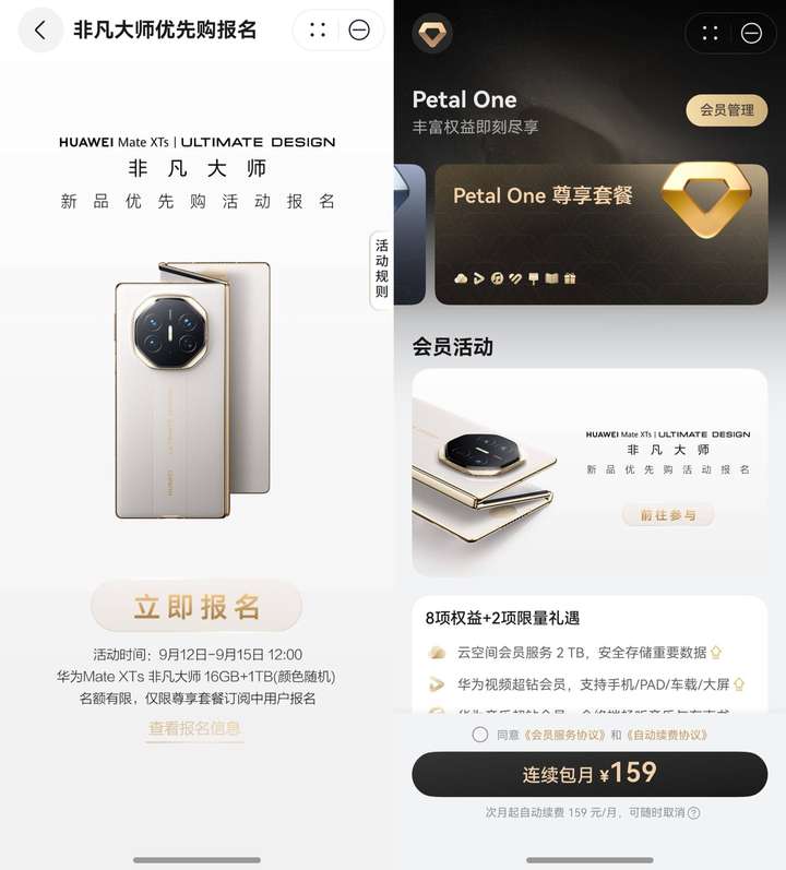 作为华为的老用户,我一直在用Petal One尊享套餐,9月12日华为Mate XTs非凡大师开启首销,Petal One尊享套餐用户的尊贵权益来了:在尊享套餐页面可以报名优先购参与资格,据说会员订阅时间越长的老用户,获得优购码优先抢购新机的概率越大!二话不说我第一时间报名!希望早日抢到新款三折叠。