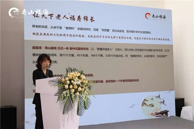 发布会上,寿山福海养老集团总裁刘玥在致辞中表示,集团对养老事业的初心坚守与责任担当始终如一,寿山福海品牌带着对 “中国老人养老本质” 的深切叩问,踏入了“养老服务”这个充满温度的行业,本发布会发布会的重要成果 “超星准・寿山福海‘五位一体’新中式服务体系”,既凝练于近二十载的深耕实践,更是从万千长寿长者的照护历程中萃取的智慧结晶。