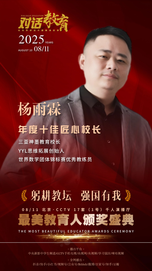 在颁奖环节中,三亚神墨教育校长、YYL思维拓展创始人、世界数学团体锦标赛优秀教练员杨雨霖(大杨老师),凭借在教育教学与人才培养方面的突出成绩,荣获“年度十佳匠心校长”称号。这一荣誉不仅是对其个人教育理念与实践成果的高度肯定,也展现了新时代教育工作者的责任与担当。