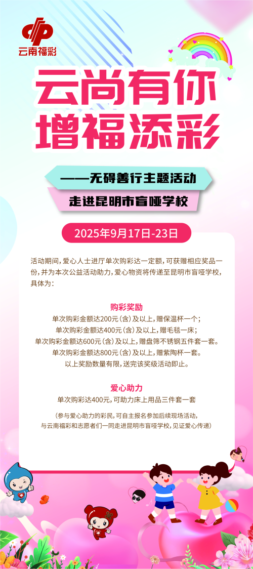 云南福彩将于 9 月 17 日启动 “云尚有你・增福添彩之无碍善行” 主题活动,以公益之名回馈购彩者厚爱,汇聚社会各界爱心力量,聚焦昆明市盲哑学校学子群体,践行福彩公益初心,为特殊教育事业注入温暖力量。