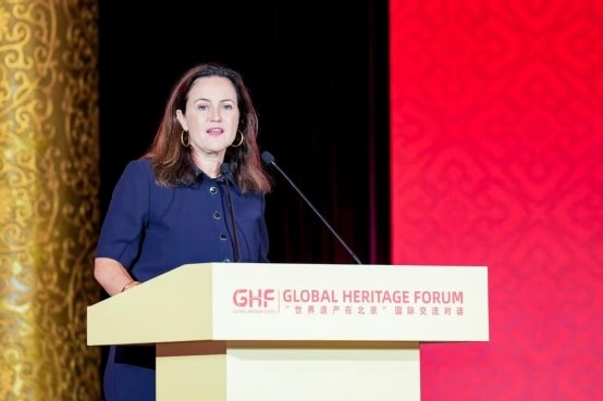 世界建筑文物保护基金会总裁兼首席执行官Ms Bénédicte de Montlaur介绍了基金会目的是与当地合作伙伴保护相应当地世界遗产,在全球设分部,最近设立中国办公室,目前有超过400名工作人员。期待和中国、北京政府更多合作,保护中国历史遗迹,达成国际合作。