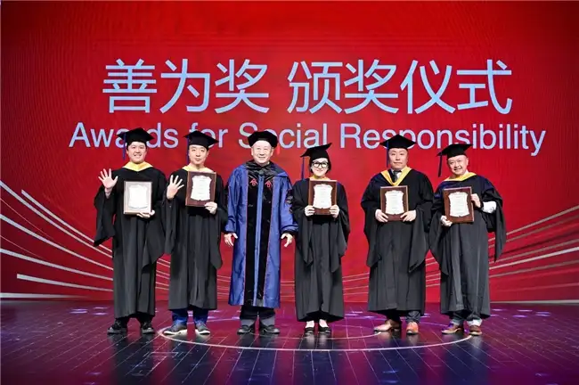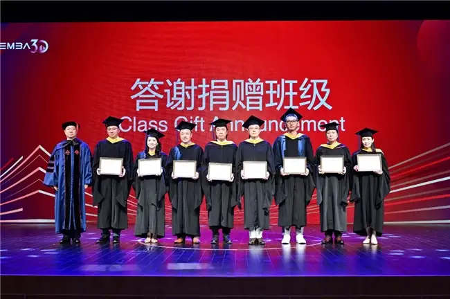 致辞环节后,汪泓院长和濮方可副院长颁发优秀毕业生奖。张维炯教授、王泰元教授颁发善为奖。毕业之际,感恩母校是一种传承,EMBA全体毕业班均参与了毕业捐赠,马磊书记及萧斌老师为班级代表颁发了捐赠证书。