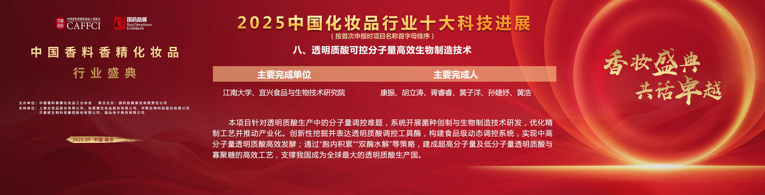 简介:本项目围绕五大关键共性技术不断突破创新,成功搭建起透明质酸分子量精准控制、交联、化学改性及接枝修饰四大核心技术平台。依托这些技术支撑,不仅精准产出不同分子量的透明质酸,更研发出多款功效各异的透明质酸衍生物原料,使透明质酸及其接枝活性物在化妆品领域的应用场景愈发丰富,助力国产高端原料一步步站上全球舞台。