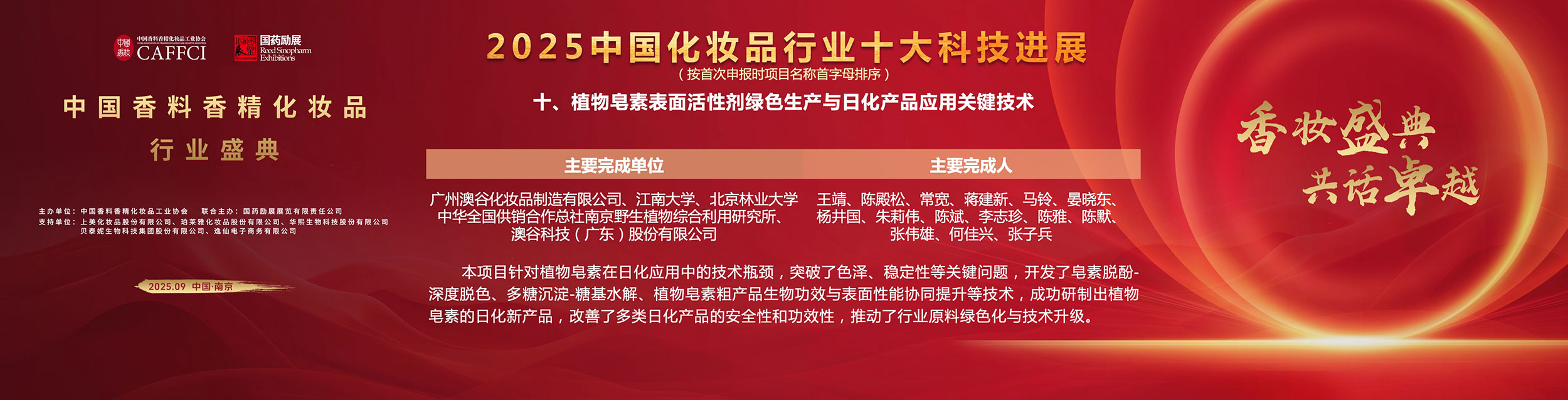简介:本项目针对植物皂素在日化应用中的技术瓶颈,突破了色泽、稳定性等关键问题,开发了皂素脱酚-深度脱色、多糖沉淀-糖基水解、植物皂素粗产品生物功效与表面性能协同提升等技术,成功研制出植物皂素的日化新产品,改善了多类日化产品的安全性和功效性,推动了行业原料绿色化与技术升级。