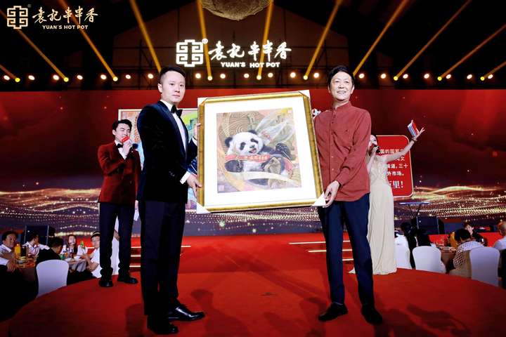现场还迎来一位特殊嘉宾 —— 著名大熊猫国画大师任伟。他特意带来画作《印象成都》,画面中熊猫憨态可掬,背景衬着成都宽窄巷子与串串香元素,将城市 IP 与美食文化巧妙融合。“希望袁记能带着这幅画里的‘成都味道’,走向更多国家。” 任伟的寄语,恰与袁记 “推动川味国际化” 的战略不谋而合。