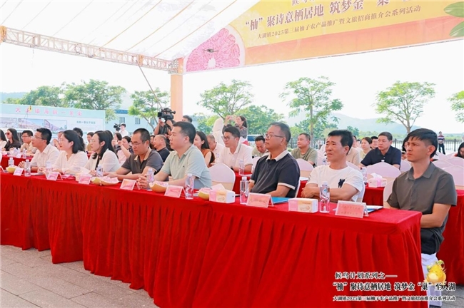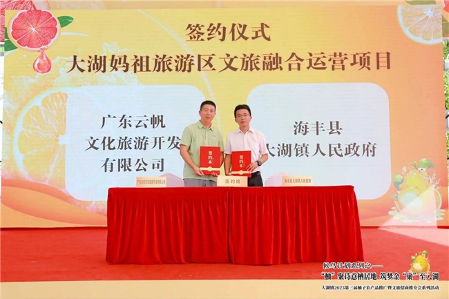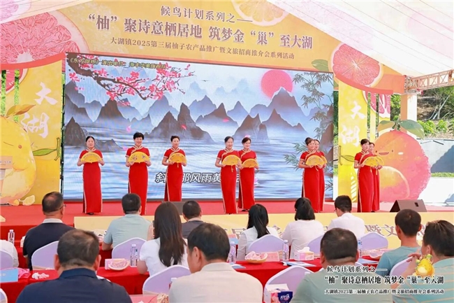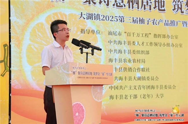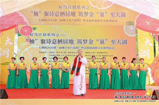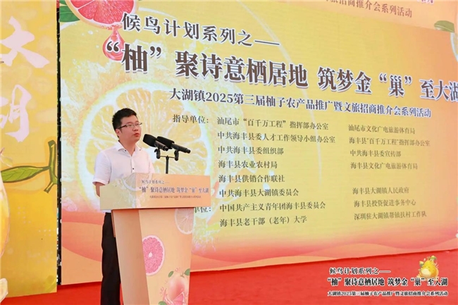 金秋送爽,柚果飘香。在喜迎中华人民共和国76周年华诞与中秋佳节的美好时节,9月29日下午,由中共海丰县大湖镇委员会、海丰县大湖镇人民政府主办的“候鸟计划”系列之“‘柚’聚诗意栖居地,筑梦金‘巢’至大湖——大湖镇2025年第三届柚子农产品推广暨文旅招商推介会”在大德妈祖广场隆重举行。活动汇聚政府领导、企业代表、行业嘉宾及市民朋友,共同见证大湖镇在“百千万工程”引领下,迈向农文旅融合高质量发展的新篇章。