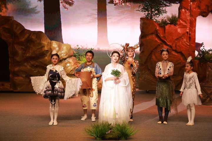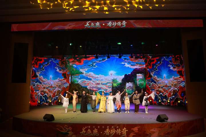 《九色鹿·香砂传奇》以敦煌壁画《鹿王本生图》为灵感蓝本,汲取丝绸之路文化意象与非遗元素,用音乐剧的形式再现了古老文明的光彩。演出中,沉香、蜀锦、胡旋舞、埙与热瓦普等贯穿始终,从服饰到音乐、从舞蹈到舞美,观众仿佛置身于飞天流云的敦煌世界,感受千年文明的温度与韵律。