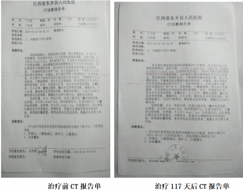 有一例患者,同时患有肝癌、肝硬化、下腔静脉癌栓,服药 117 天后,下腔静脉癌栓消失,肝脏包块由 10.6×10.2cm 缩小至 10.2×4.5cm(附治疗前后 CT 报告单)。还有一例淋巴肉瘤患者,曾接受手术切除,不久后复发,随后采用 7 次化疗、2 次靶向联合免疫治疗,但肿块不但没有缩小,左大腿的包块反而逐渐增大到儿头大小,还出现了纵隔转移灶。患者回家后,经服用 “愈癌散” 等药物治疗 150 天,体表包块全部消失;此后三年,一直在外务工,生活、劳动均无阻碍。