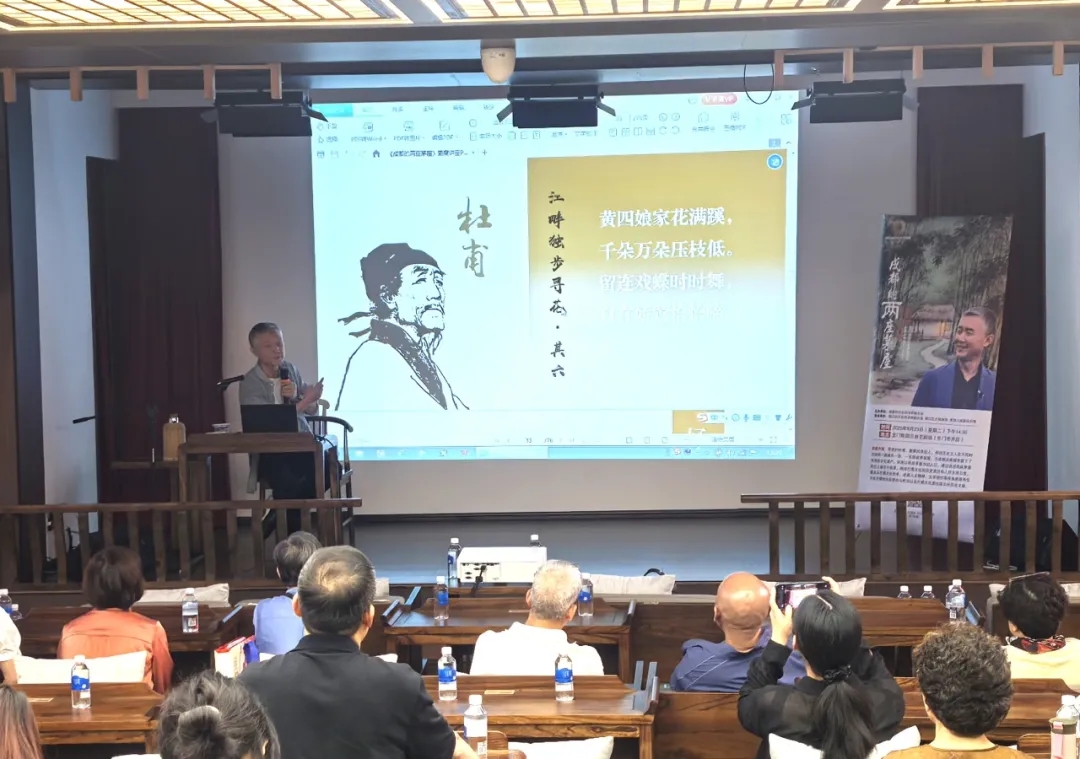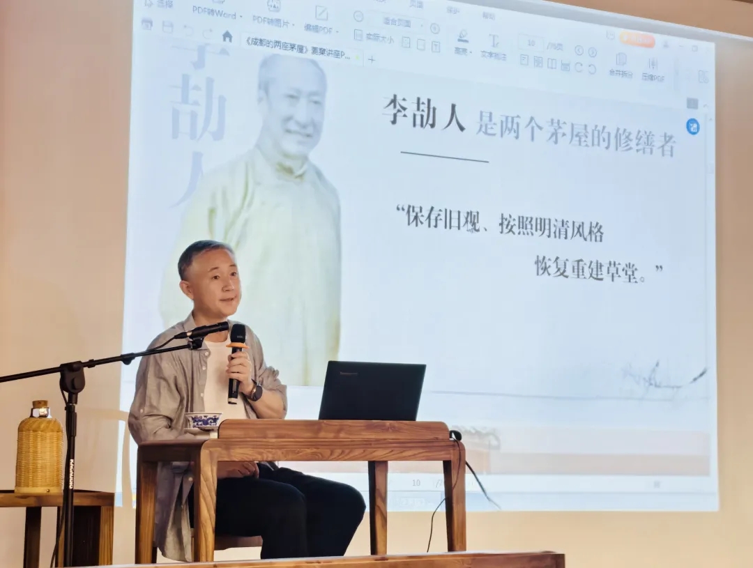 在成都,有两座茅屋。一座在城西,是著名的“杜甫草堂”;一座在城东,是李劼人先生的故居“菱窠”。9月23日,巴蜀文化传承与发展,由成都市社会科学界联合会主办,锦江区社会科学界联合会、锦江区文体旅局、李劼人纪念馆协办的“金沙讲坛•分讲坛”2025年第11期(总第736期)《成都的两座茅屋》在龙门阵四川曲艺剧场(东门市井店)开讲。东周社创始人、主讲人,四川师范大学客座教授周东以草堂的杜甫、菱窠的李劼人两位历史文人的生平故事,阐述巴蜀文化的历史变迁。