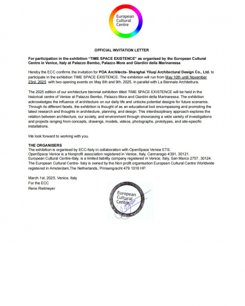 近日,应欧洲文化中心( European Cultural Centre)的邀请,POA建筑事务所( European Cultural Centre)受邀参展,其作品将在威尼斯本博宫(Palazzo Bembo)展出。
