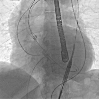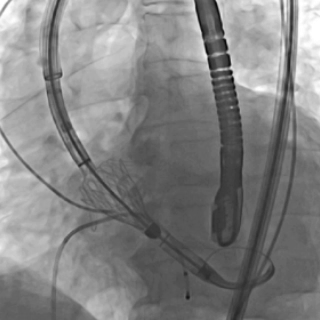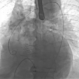 瓣膜释放后造影检查瓣膜位置,功能、形态良好,未见明显反流及瓣周漏