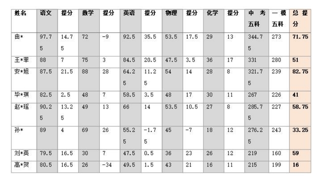 在短短两个月(5月至7月)的中考冲刺阶段,参与学生中考总分平均提升51.3分(相较一模成绩),其中最高个人提分达82.75分。抽样8名学生数据显示,各单科提分均超过11分(见表1)。