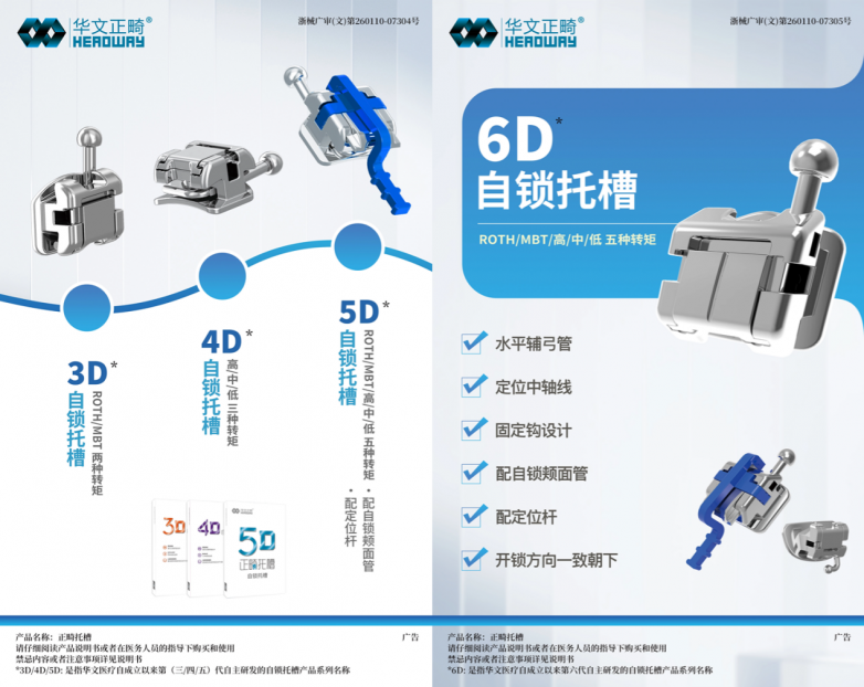 在本次展会上,华文将全面展示其自锁托槽、支抗钉等系列产品,满足不同层级医疗机构的多样化矫治需求。华文3D自锁托槽以高性价比满足基础需求;4D自锁托槽通过高/标准/低三档转矩精准控制牙齿移动;5D自锁托槽创新定位杆辅助标尺提升操作精度;6D自锁托槽的水平辅弓管设计适应复杂矫治力应用。7D与青春版自锁托槽则凭借弧面自锁形体圆滑、极致无痕的设计,显著提升患者舒适度。