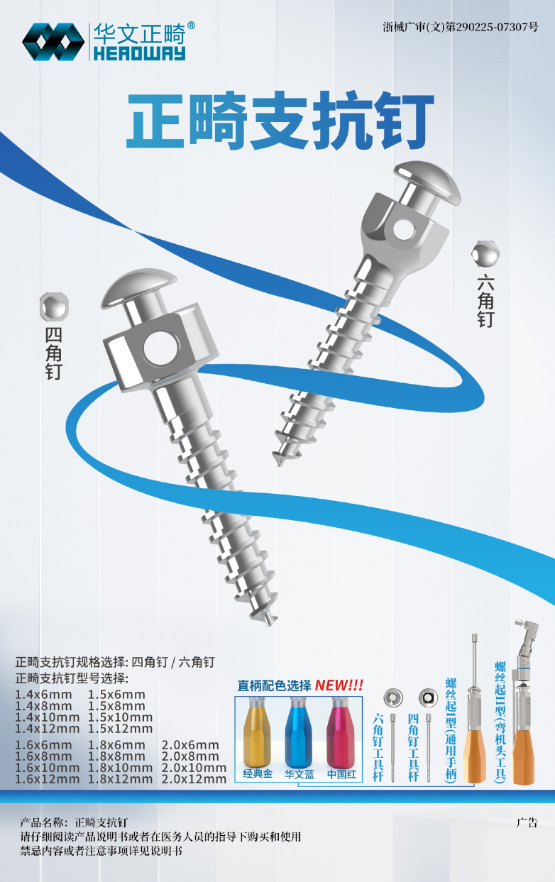 在支抗钉领域,华文提供四角钉与六角钉双形态选择。其扩大颈部设计拓展了操作空间,圆滑钉头减少黏膜刺激,无尖头结构避免植入断裂。华文支抗钉采用抗过敏材质,配合科学螺纹提升固位性,降低二次植入风险。