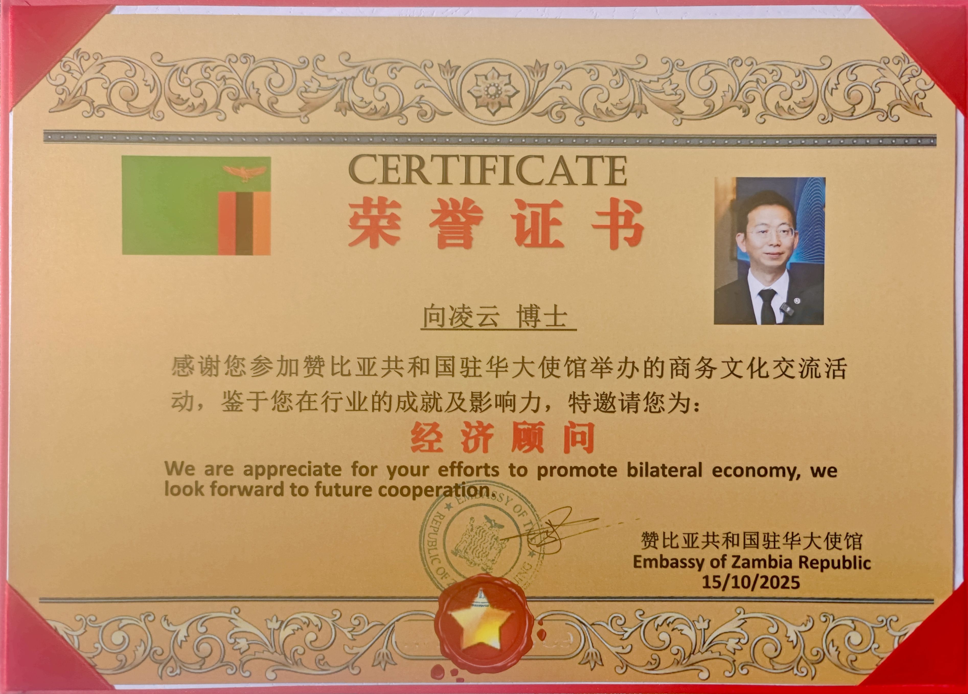 2025年10月15日,赞比亚驻华大使馆隆重举行仪式,正式特邀著名旅美经济学家、投资人——向凌云院士担任赞比亚驻华大使馆经济顾问,并由赞比亚驻华大使齐乌卢阁下(H.E. Mr. Howard Chifumbu Sichilima)亲自颁发荣誉证书。