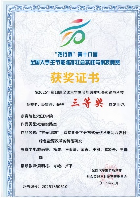 《农光绿韵——双碳背景下分布式光伏发电助力农村绿色能源改革路径研究》项目,荣获全国三等奖,成为全校文科团队在该理工主导赛事中唯一获奖项目。项目融合经管视角与数理建模,通过1162份问卷与实地调研,提出“多元协同+智能运维”农村光伏推广方案,展现了文科生参与国家战略议题的独特视角与能力,是“新文科”建设与跨学科育人的成功实践。