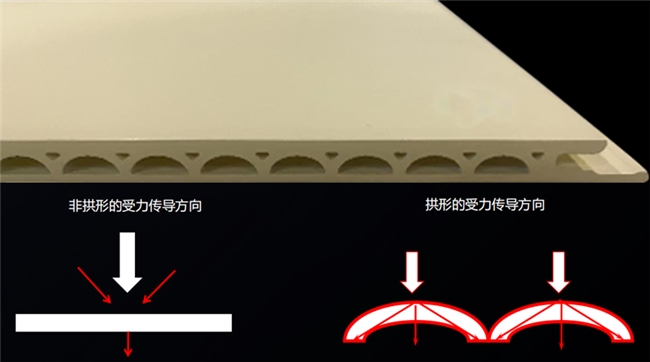 首先,这得益于其独特的桥拱空芯结构设计,拱形受力后会向两边分散力道,说明墙板在实际使用过程中能够承受荷载的能力强,不容易变形,稳定性好,并且在受到碰撞时不易产生压痕或划痕,更加经久耐用。